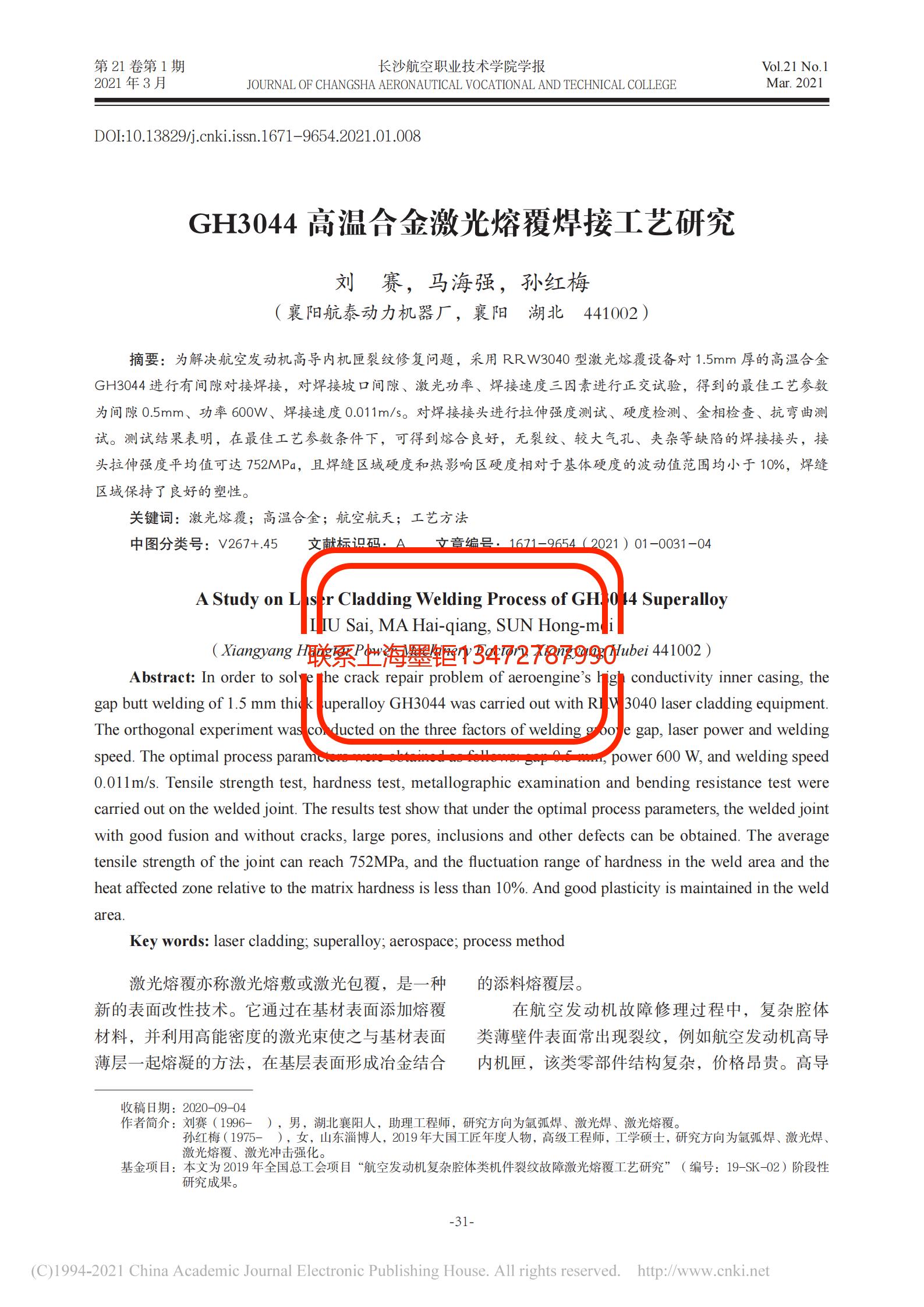 技術文章 GH3044高溫合金激光熔覆焊接工藝研究 更新時間 2021-07-17 05:44:59 閱讀 881 上一篇:冷卻速率導致的薄壁效應對K465合金顯微組織和持久性能的影響 下一篇:鎳基高溫合金氧化膜焊前激光清洗工藝研究